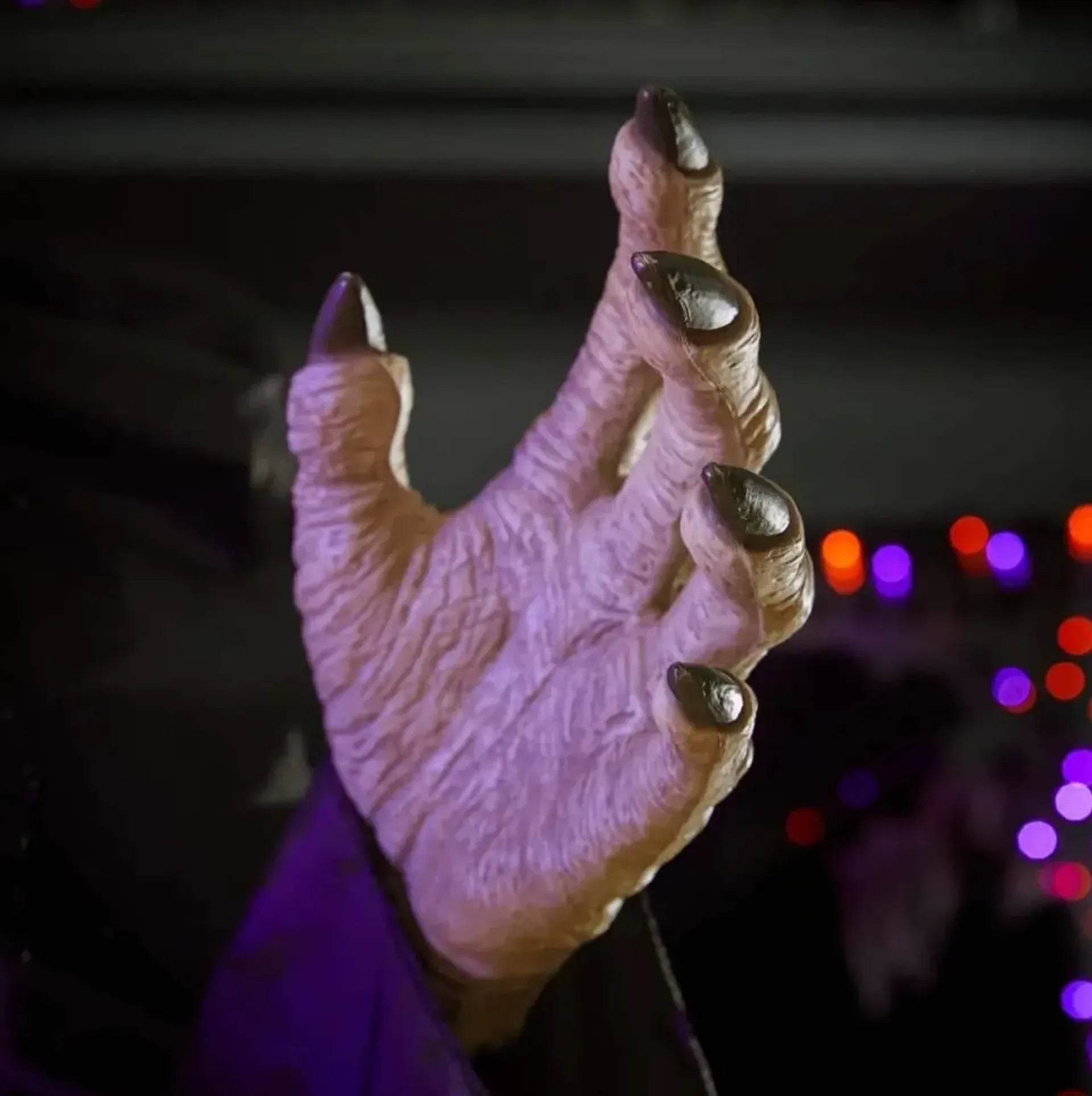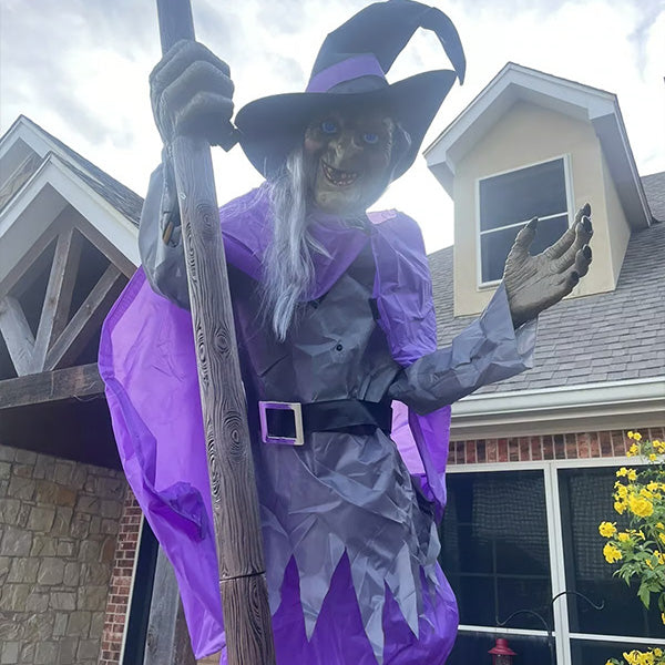 The animatronic witch, who floats with her feet, creates a spooky atmosphere during the Halloween festivities.