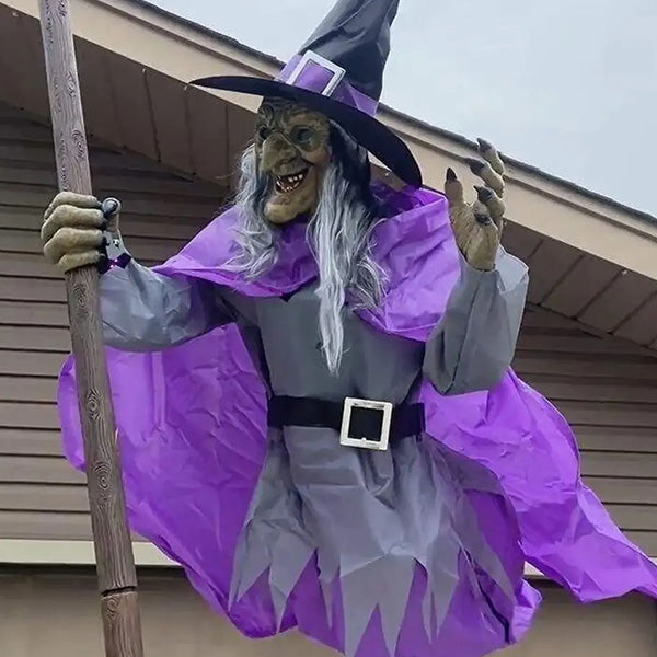 Designed for outdoor use, this animatronic flying witch is the perfect centrepiece for any Halloween party.
