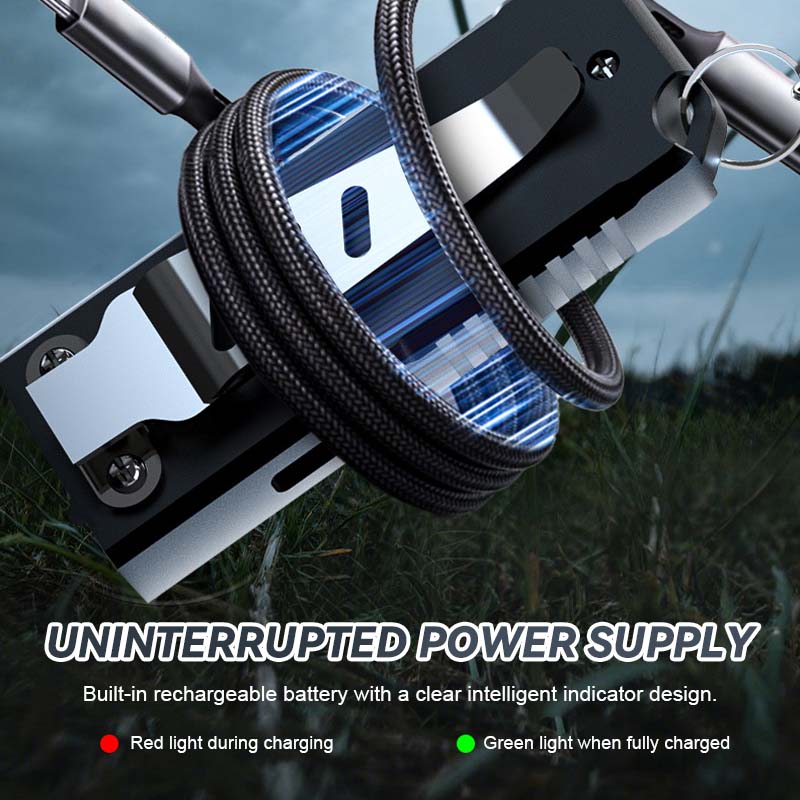 Features a built-in rechargeable battery with smart LED indicators — red while charging, green when full.