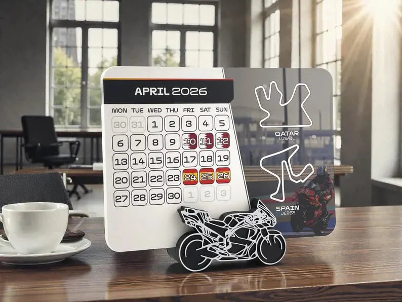 Never miss another race weekend again! With this unique MotoGP race schedule calendar you can get ready and excited for every upcoming race weekend. These calendars consist of a custom designed MotoGP bike stand and 12 distinct premium cardstock pages for every month of the year.